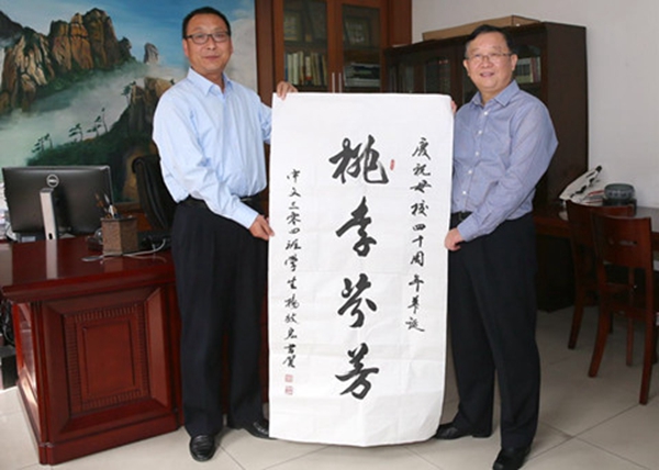 杨效宏愉快答应到时一定回母校参加相关活动,当谈到学校这几年的发展变化时,杨效宏动情说道,这几年总想回母校看看,但苦于事务繁忙,一直未能成行,但对母校的感情和老师的培养教育铭记于心。当听到学校在校生已达到12000多人时,杨效宏高兴地为母校书写了 “桃李芬芳”四个大字。王山稳对母校的关怀表示感谢,为母校取得的发展成就衷心感到骄傲。他表达了对母校40华诞的美好祝福,并且表示会持续关注母校,希望母校越来越好。