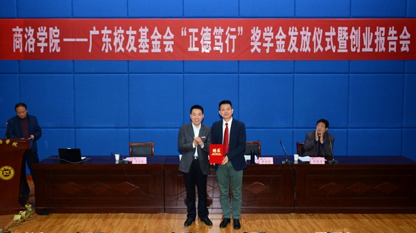 李玉望介绍了“正德笃行”奖学金设立的相关情况,并表示自己作为广东校友基金会的代表、作为奖学金设立方,为获奖学生颁发奖金证书,就是要将“商洛学院精神”传承下去,让每一名商洛学院学子都有获得感、存在感、荣誉感,希望学弟学妹们树立远大目标,努力回馈社会,树立担当奉献意识,为今后的成才成功奠定良好基础。