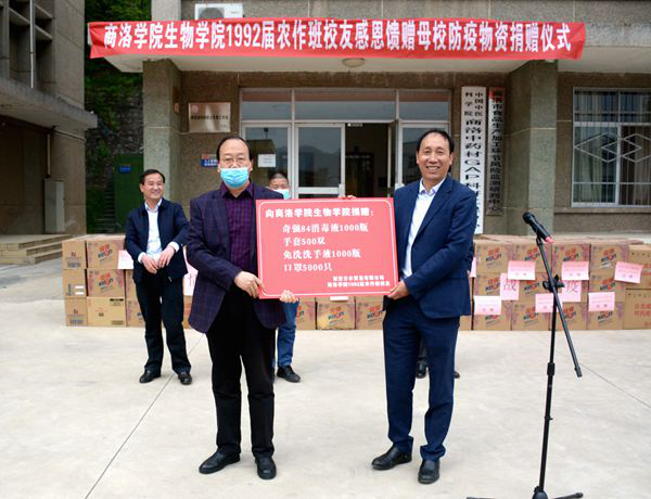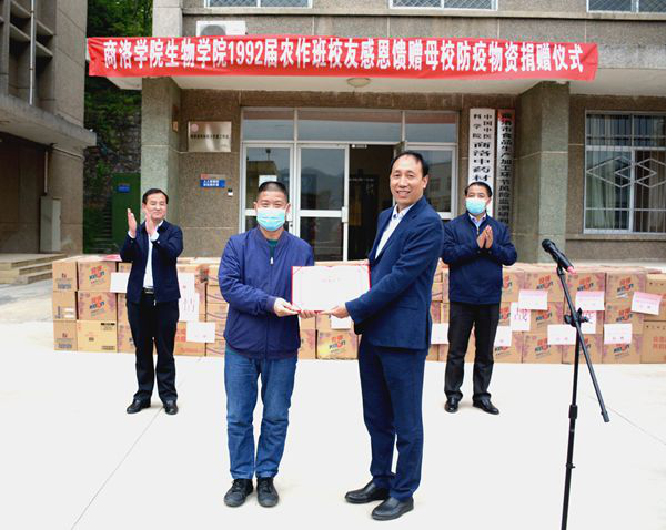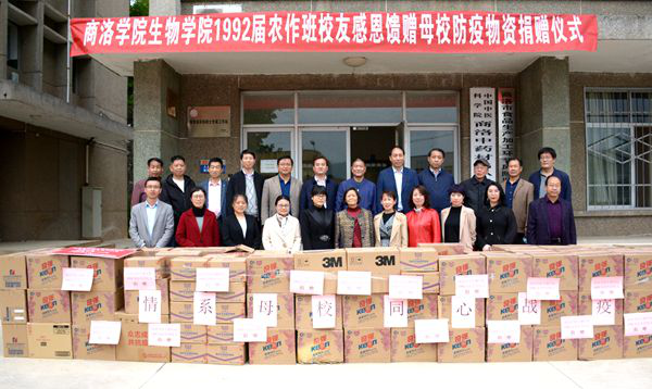 4月22日,我校生物学院92届校友向母校捐赠价值10万元的防疫物资。校长范新会,副校长王新军,校友代表、洛南县委副书记马建琦及西安方尔贸易有限公司总经理林建军出席在学校举行的捐赠仪式。院长办公室、生物学院负责人,教师代表,生物学院农作班92届部分校友参加捐赠仪式。