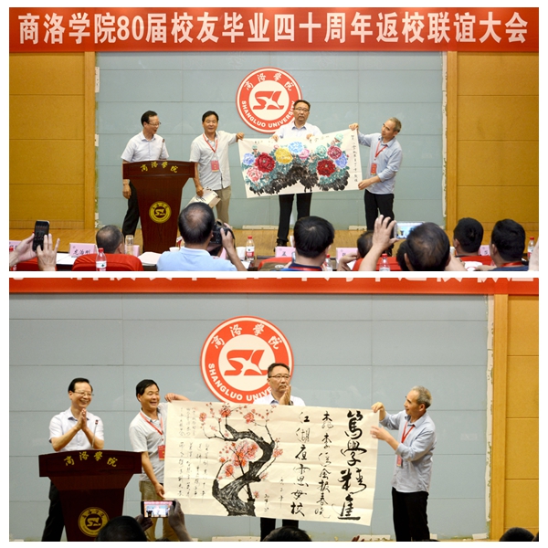 商洛学院80届校友总联络人孟军,在联谊大会上代表全体校友感谢学校对此次活动的重视和支持,并现场赠送《桃李清风报春晓·江湖夜雨思母校》《牡丹图》等书画作品表达对母校的深情厚意。他在发言中表示,忆往昔,岁月峥嵘,母校承载了一代人的青春时光,不管如今身在何方,故土的乡情、母校的恩情、师生的友情都绝不能忘;看今朝,倍加珍惜,80届校友们亲身经历了祖国改革开放40年的发展变化、亲眼目睹了母校翻天覆地的发展壮大,这些来之不易的成果需要我们共同呵护珍惜;讲未来,豪情满怀,如今的祖国屹立于世界之林,扬起了大国的风帆,如今的商洛学院作为陕西省“一流学院”建设单位,已成长为一棵枝繁叶茂的大树,站在新时代的节点展望未来的发展,我们信心满满。衷心祝愿祖国的明天更美好、母校的未来锦绣如花。