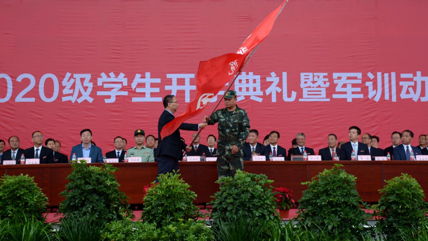 大会伊始,全体起立,奏唱国歌,升国旗。龙治刚为2020级学生军训团授团旗,范新会讲话,刘宝盈宣读2020级新生奖学金表彰决定,出席大会的校领导与嘉宾为获奖新生颁奖。
