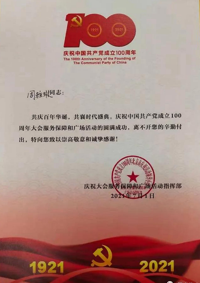 7月1日,庆祝中国共产党成立100周年大会在天安门广场隆重召开。我校人文学院汉语言文学1804班入伍学生周雅琳在北京天安门广场参加了大会联合军乐团演奏,用实际行动为党的百年华诞献上了最诚挚的祝福。各级各类媒体纷纷以“秦岭深处飞出金凤凰”对周雅琳进行专题报道,她为商洛争光事迹在群众和师生中不胫而走,成为广泛流传的佳话。