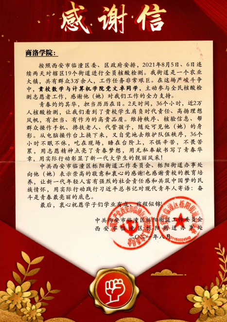 近日,中共西安市临潼区栎阳街道工作委员会、街道办事处向我校发来感谢信。信中热情赞扬了我校学生党文卓在栎阳街道全民核酸检测志愿服务工作中所作出的贡献,同时对我校教育培养优秀学生表示诚挚感谢。