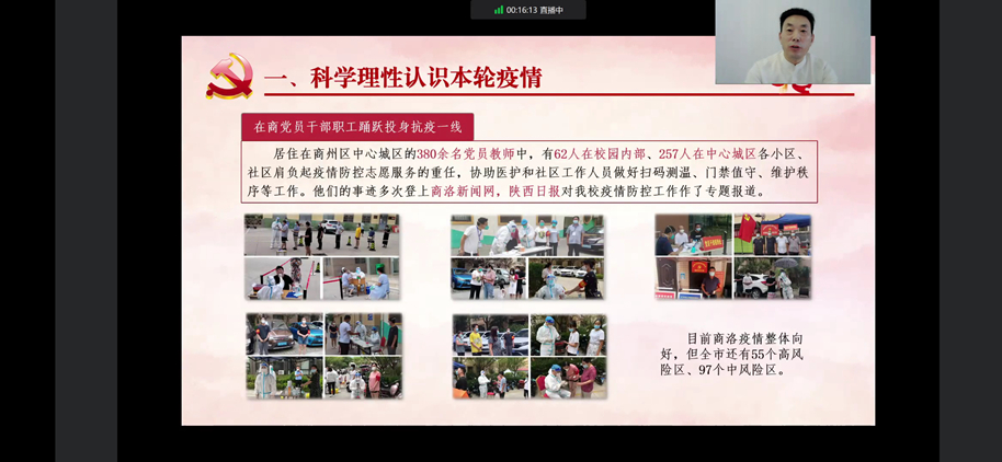 党委书记张志昌在授课中指出,自疫情发生以来,学校深入贯彻落实习近平总书记关于疫情防控工作的重要指示精神以及属地疫情防控工作要求,迅速启动防控预案,科学防控,有力维护了校园安全稳定大局和师生生命安全健康。