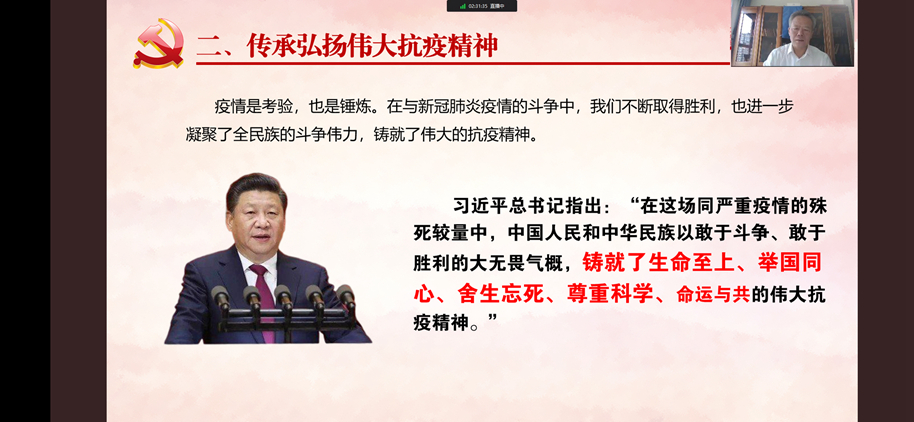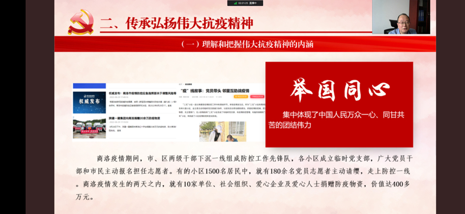 校长范新会在讲授中引用多个鲜活事例,生动形象地阐述了生命至上、举国同心、舍生忘死、尊重科学、命运与共的伟大抗疫精神内涵,系统性总结了中国战“疫”取得的伟大成就。结合近期国内、我省和商州区等疫情防控形势,范新会强调,青年学生要深刻理解和传承弘扬伟大抗疫精神,把握伟大抗疫精神的内涵。一是要肩负使命担当,与祖国和人民同呼吸共命运。青年学生要把学问做在祖国大地上,做接地气的真学问,要到祖国和人民最需要的地方去摸爬滚打,在疫情防控、科技创新、乡村振兴中发光发热,从中找到人生真谛、生命价值和事业方向。二是要厚植爱国情怀,做积极战“疫”的先行者。青年学生要带头遵守疫情防控各项要求,主动传播疫情防控权威信息,分享正能量抗疫故事,解读疫情防控方针政策。要敢于挺身而出,发挥所长、尽己所能为防控工作助力。要服从组织安排,落实安全防护,规范有序参与疫情防控志愿服务,在筑牢校园、社区防疫屏障中,展现商洛学院人应有的昂扬斗志和青春力量。
