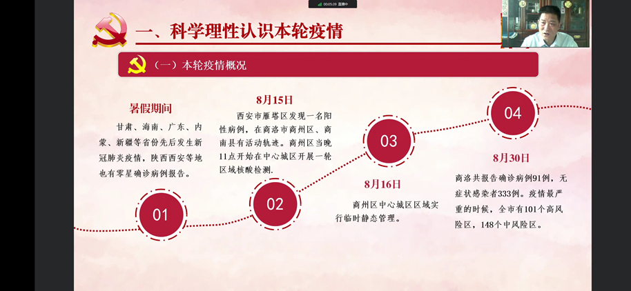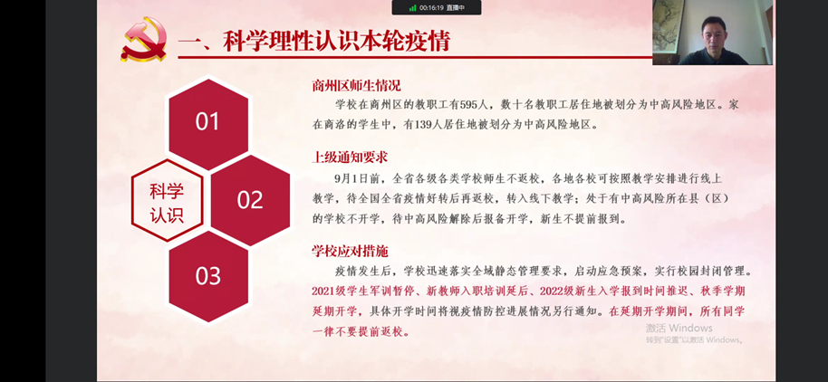 为深化大学生思想政治教育,强化师生疫情防控意识,引导广大青年学生严格落实疫情防控各项工作要求,弘扬伟大抗疫精神,以实际行动迎接党的二十大胜利召开,8月31日下午,校领导张志昌、范新会、彭虎军、刘勇、刘宝盈、王新军、郭瑾以“云端授课”的形式,为全体学生讲授“开学第一课”。