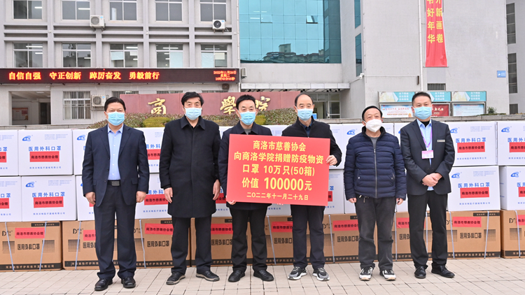 11月29日,商洛市慈善协会常务副会长兼秘书长陈知武代表协会向我校捐赠10万只医用口罩,再次为我校疫情防控工作贡献力量。校党委副书记彭虎军代表学校接受捐赠。此前,市慈善协会曾于今年年初向我校捐赠过一批口罩等防疫物资。