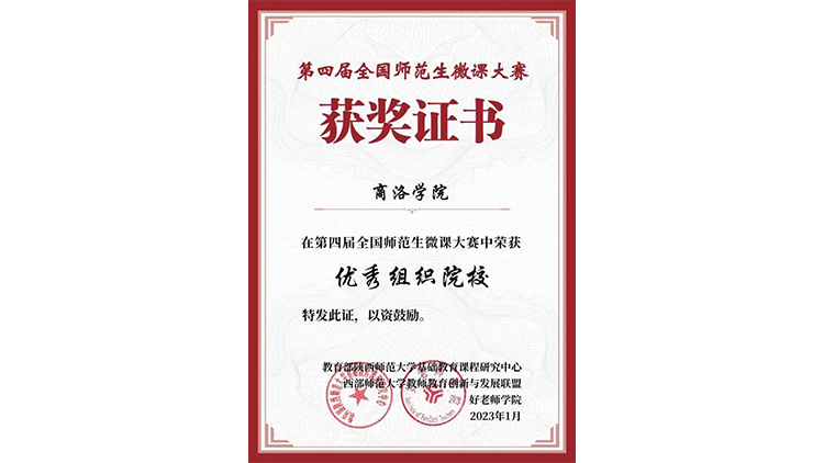 近日,第四届全国师范生微课大赛结果公布。我校师生获得各类奖项13项,其中学生荣获特等奖1项、一等奖2项、二等奖8项,人文学院乔金果老师荣获优秀指导教师,学校荣获优秀组织单位奖。这是我校参与此项赛事以来首次荣获优秀组织奖,实现了学校集体奖、学生获奖等级和获奖总数多项突破。