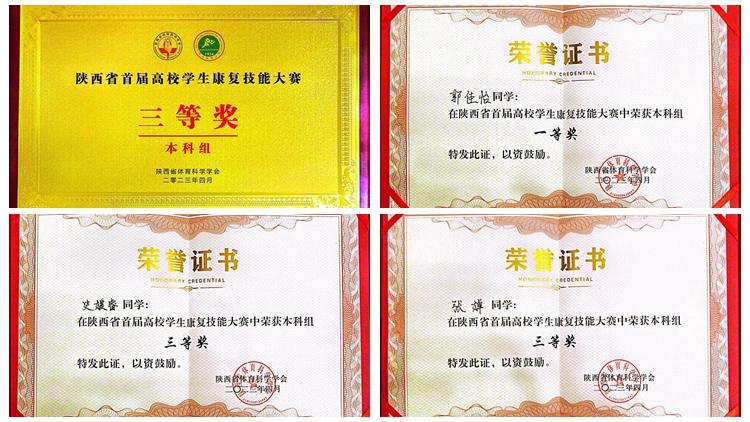 3月31至4月1日,由陕西省体育科学学会、西安体育学院共同主办的“陕西省首届高校学生康复技能大赛”在西安举行,来自全省11所本科院校和4所高职院校的15支代表队参加了比赛。我校健康管理学院康复治疗专业郭佳怡、史媛睿、张婵3名同学组队参加了大赛。经过激烈角逐,我校代表队取得大赛本科组团体三等奖,个人一等奖1项、三等奖2项的好成绩。