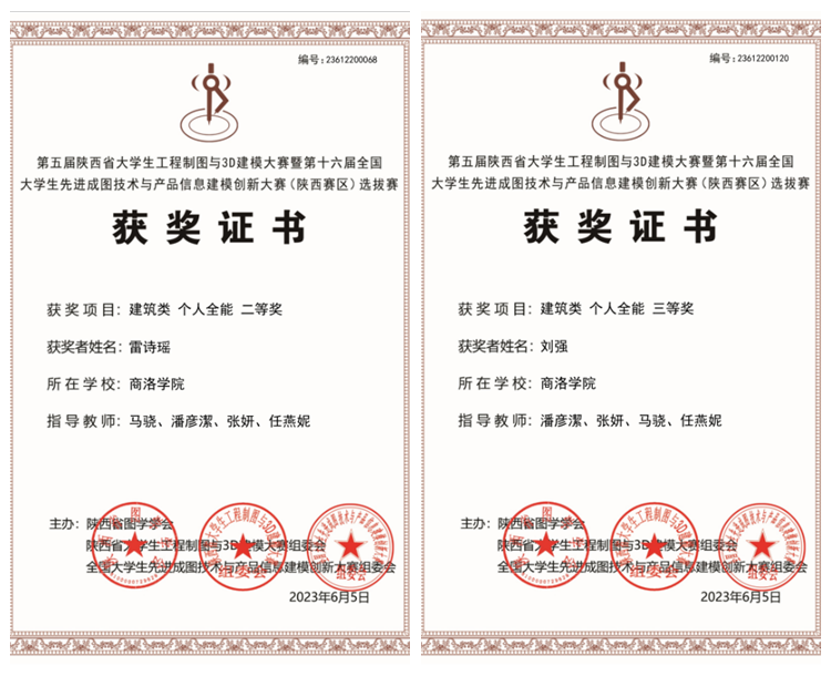 6月5日,2023年第五届陕西省大学生工程制图与3D建模大赛暨第十六届全国大学生先进成图技术与产品信息建模创新大赛(陕西赛区)选拔赛结果揭晓,我校城乡规划与建筑工程学院9名学生参赛,5人获得国赛参与名额,其中2人获得比赛奖项。雷诗瑶在建筑类(个人全能)中获二等奖,刘强在建筑类(个人全能)中获三等奖。