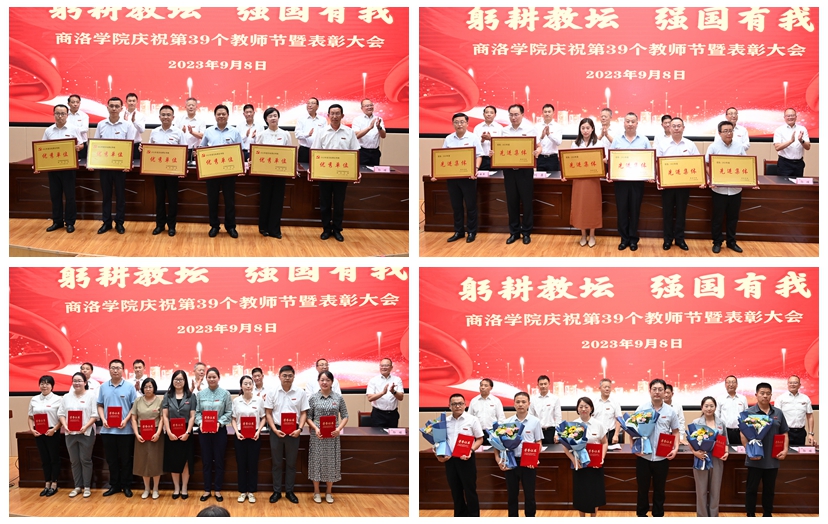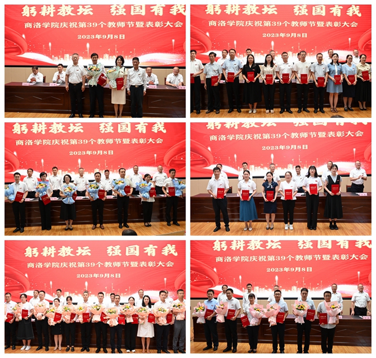 在热烈的掌声中,大会对我校荣获2023年陕西省教书育人楷模、第十三届陕西普通本科高等学校教学名师、商洛学院首届黄大年式教师团队、2022年度全省教育系统先进个人、学校目标责任考核优秀单位、2023年度先进集体、优秀教师、优秀教育工作者、我最喜爱的老师以及在教学、科研和学生工作中取得突出业绩的教师进行了表彰。