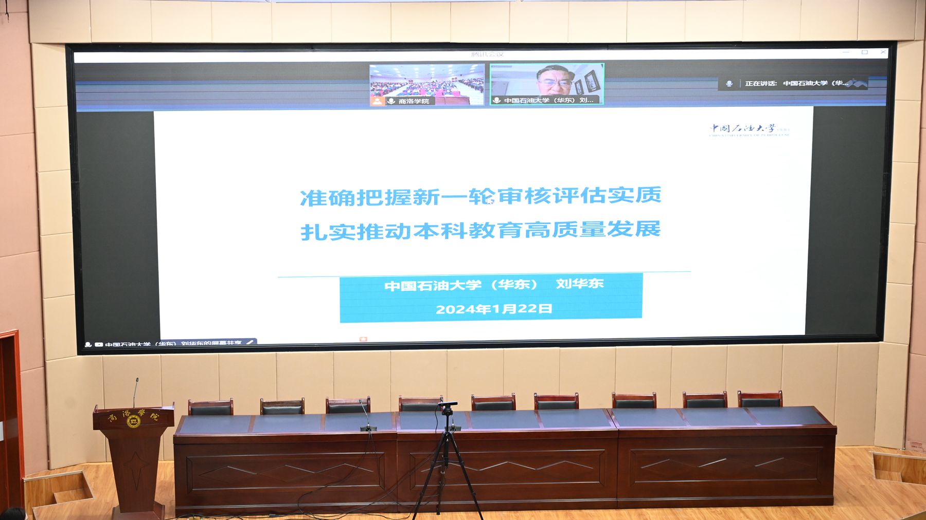 1月22日上午,我校召开审核评估工作迎评动员会,全面部署本科教育教学审核评估相关工作。中国石油大学(华东)校务委员会副主任,原党委副书记、副校长刘华东教授应邀作专题辅导报告。校党委书记张志昌作动员讲话。校长范新会主持大会。党委副书记刘勇,副校长刘宝盈、王新军、郭瑾出席会议。