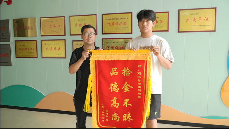 6月18日下午,榆林市民宋先生来到我校,将一面印有“拾金不昧 品德高尚”字样的锦旗送到电信学院电子信息科学与技术专业2102班学生雷腾手中,对雷腾同学拾金不昧的高尚品德表示衷心感谢,并对学校培养教育乐于助人的优秀学子表示高度赞扬。