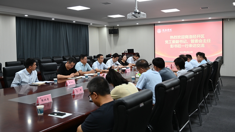 王新军对彭书旺一行莅临学校表示诚挚欢迎,对商洛经开区批准建设以来取得的成绩表示祝贺,他指出,商洛经开区立足禀赋优势,创新引才用才政策,谋准产业定位,推动企业提质增效,成功通过省级认定,是科技创新驱动发展新质生产力的重要载体。他简要介绍了我校办学定位、特色与办学成果,重点介绍了《商洛学院服务商洛高质量发展50条措施》的落实情况及取得成效。他表示,学校将深刻学习领会党的二十届三中全会精神,自觉融入和服务商洛高质量发展大局,持续深化“三项改革”,深度融入秦创原创新驱动平台,凭借创新政策和优质平台推进科技成果转化。希望双方以此次合作交流为契机,推动产学研用深度融合,提升科研成果转化实效,搭建“人才共享、资源共用、科研共建”的沟通交流平台,共同推进区域高质量发展。