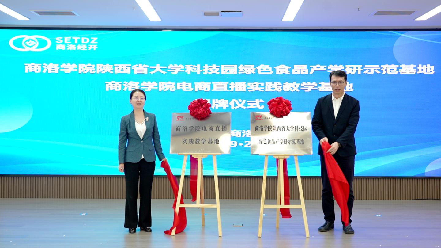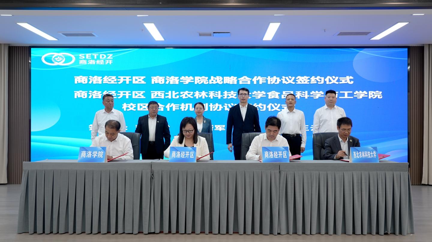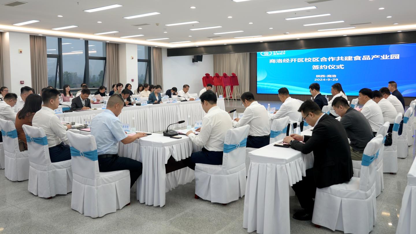 为推动校区合作和产学研深度融合,提升商洛经济技术开发区科技创新与经济发展效能,9月29日,商洛经开区校区合作共建食品产业园签字仪式在商洛市举行。商洛市委副书记、商洛经开区党工委书记赵孝,洛南县委书记杨长江,校长权雅宁、副校长王新军出席签约仪式。赵孝、权雅宁共同为“商洛学院陕西省大学科技园绿色食品产学研示范基地”和“商洛学院电商直播实践教学基地”揭牌。王新军代表学校和商洛经开区党工委副书记蒋金君签署战略合作协议。签约仪式由商洛经开区管委会主任彭书旺主持。
