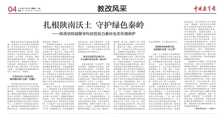 文章指出,商洛学院以“绿水青山就是金山银山”理念为指引,主动承担守护秦岭生态、传承秦岭文化的历史使命。学校聚焦秦岭区域的尾矿治理、水源保护、循环发展等方面问题,凝练提升材料化工、生物医药、教师教育3个优势学科,带领师生深入秦岭保护工作的各条“战线”,在校地融合发展的新篇章中勇担“秦岭卫士”职责。